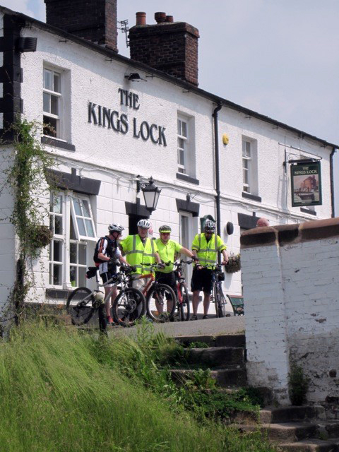 On arrival at the Anderton boat lift it was fortuitous that a barge was entering at that moment and this was observed with much interest. Momentum continued with the group heading down the Trent and Mersey arriving at the Kings Lock at Middlewich where lunch was had in the gardens of the canal side hostelry of the same name. From here the Middlewich Branch was navigated joining the Shropshire Union Canal at Barbridge. The last leg for the day was a run straight down the canal passing through Audlem, with a stop at The Shroppie Fly canal side pub, where the first puncture of the trip was had by Steve Walls, before moving onwards for Adderley, coming off the canal near to Market Drayton for the first overnight stop of the tour at The Four Alls, Woodseaves. One part of the ride had caused some amusement for a number of road signs could be seen which gave the direction towards ‘the Secret Nuclear Bunker’. Further investigation shown this to be the now decommissioned building and bunker at Hack Green which would have been the centre of regional government had a nuclear war broken out. The final part of the first day showed a distinct change in weather with the group having to travel the last few miles through an electrical storm amid torrential downpours, which although of tremendous ferocity failed to dampen the spirit of the group. Gathered around the dining table of the Inn for their evening meal the seven members of the group were absolutely delighted to be joined for the evening by John and Bibi Cherry and Bob Fisher. These had all been instrumental in the plotting and planning of the route and logistics and would have been alongside for the journey. Sadly Bob (father of rider Dave Fisher) had had to withdraw the previous day due to health problems, and John had been fortunate enough to have been given tickets for the Trooping of the Colour celebration for himself and family, the date of which clashed with the ride. After saying their farewells the team turned in for a well deserved sleep. |