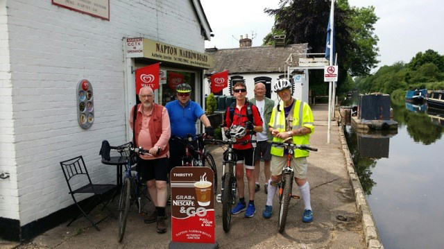 While the riders were carrying on cycling their last leg of the day the support team headed for the Crossroads Hotel in the town of Weedon, situated where the A45 dissects the A5. While John booked into the rooms for the night Stu and Geoff made the short walk to the canal bridge in readiness for the riders arrival. Fortuitously for Geoff, there yards from the canal, stood a specialist bike shop, Joyride Cycles, and with only five minutes left before closure for that day, he was able to purchase replacement inner-tubes plus a spare. Tomorrow would now be back on the road again. The days cycling mileage was a relatively short 46.2 miles, now making the total at 179 miles since leaving Liverpool. |