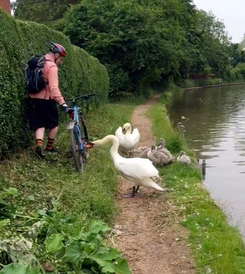 The start of the day brings a realisation that the halfway point has nearly been reached and with a 9 o’clock start from the hotel the riders retrace their route back onto the canal. Quickly passing through the Hatton Locks the team headed to the Cape of Good Hope where the support vehicles waited with fresh drinks and protein bars. Although tough going at times the ride improved as they passed through Warwick then quickly followed by Royal Leamington Spa before heading back into the countryside. Many pitfalls had been overcome successfully up to now, including overgrown bushes trying to force any rider into the canal, the same with low branches from the overhanging trees. The riders had become used to the acidic embrace of the wayside nettles and of the bramble scratches en route, but now they became completely stopped in their track. Mr and Mrs Swan and their six youngsters laid claim to the canal bank and steadfastly refused to give way. Our intrepid explorers were at a loss as the former swan master, Stu Hyde, who had been a rider on the last two trips was, alas, sitting in the support van today, having injured his achilles tendon just days before the ride began, while out on a practice ride. Stu had previous experience of this type of situation. After much discussion, the hero of the hour, Geoff Cuthill, stepped forward, some may say he was physically encouraged or simply pushed, and using his bike as a shield, made a successful pass, Mr Swan wrongly choosing to peck the bike, and not his legs. Following Geoff’s example, it took another five or so minutes for the group to negotiate this unforeseen hazard amid much childlike merriment as each individual passed by. |