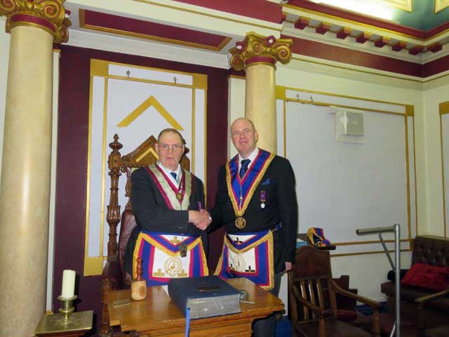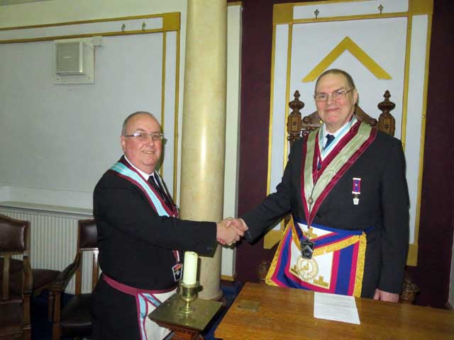 W.Bro. William Walker I.P.M.M. congratulates the Worshipful Master. |