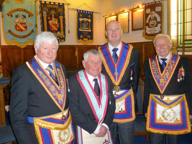 Heading the list of visitors was Provincial Junior Warden Tony Cross in what was his last visit in that role as a representative of the P.G.M. He was accompanied by other acting provincial officers in the persons of visitors Peter Hampson and Austin Fletcher as well as Furness members Keiron Mullan and Dave Sear. |