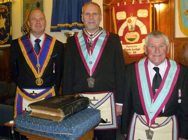 The work of Bill Glassey in installing Barry Fitzgerald as his successor in the chair of Furness Mark Lodge No 36 at Barrow in Furness Masonic Hall was top class. It was fitting that a good turn-out of 60 members and guests were present to witness the proceedings. |