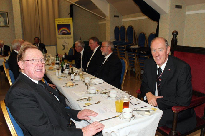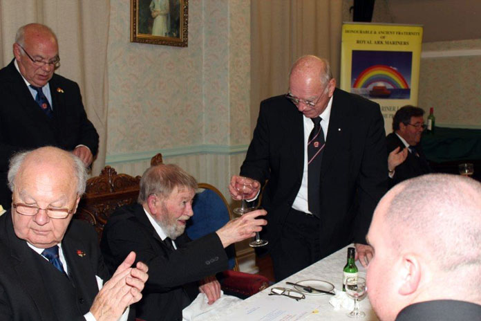 The Festive Board was a typically happy event for Mark Masonry. Geoffrey Lee welcomed the 20 grand Officers present, and congratulated Peter Jackson for a superb ceremony, and all the officers for the manner in which they had performed. Our Deputy Prov.GM then went on to stress the fun, friendship and fellowship of the happy Mark Degree, and that we should always attend our meetings and encourage others to join the Craft, and then Mark, and then the Royal Ark Mariner Degree - he asked why we were depriving him of the privilege of meeting our friends who have not yet joined! A good point indeed.... We have a lower RAM membership than some other Provinces, and he encouraged us to spread the word about this very colourful and happy Degree. |