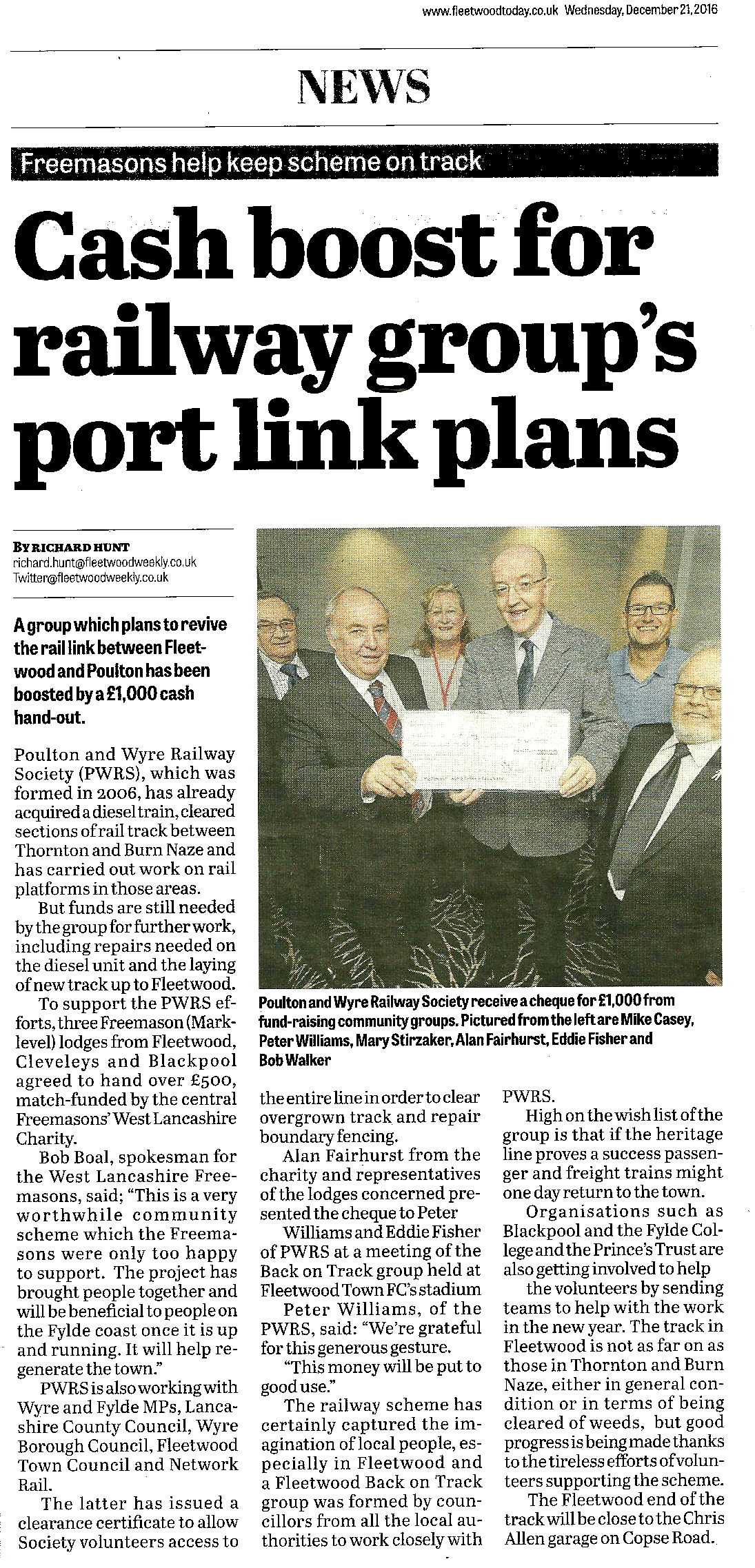 So, when local Mark Masons, some of whom are railway enthusiasts themselves, (the ubiquitous Jimmy Rogers is a PWRS member...) heard of the efforts which the Society was putting in to improve on the attractions to be had on the local scene, three Mark lodges; Prince Setanta No 1446, Wyre Mark Lodge No 754 and Cleveleys Mark Lodge No 1176 raised £500 between them. |
