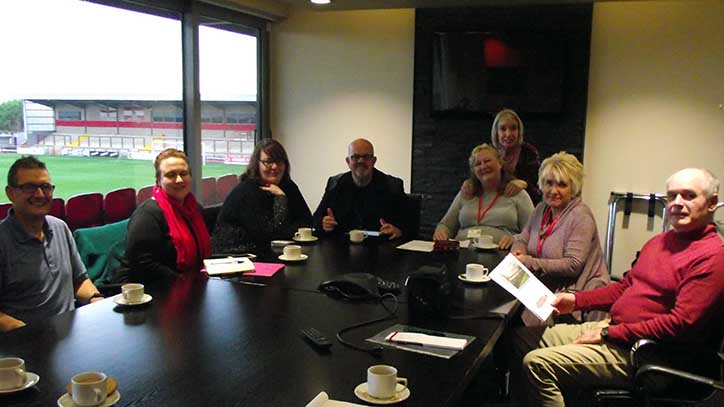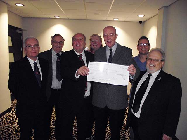 Mike Casey and Bob Boal from the Corinthian Mark Charity, Jimmy Rogers IPM and Bob Walker the current WM of Cleveleys Mark accompanied Alan Fairhurst PrGJW, who was representing the PGM, made the presentation of the cheque to Peter Williams and Eddie Fisher of PWRS at a meeting of the Back on Track group held at Fleetwood Town FC’s stadium. |