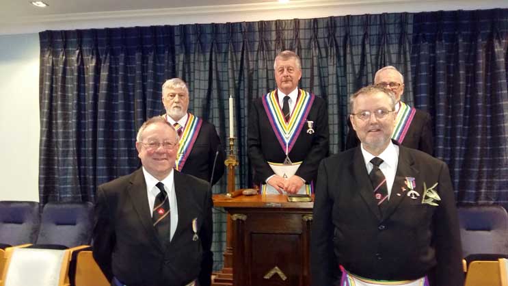 Bro S. Leech, W.Bro G. J. Jackson RAMGR, WC. Bro. John Thornton, Bro. Anthony Thackrah and W.Bro. R.G. Kinder RAMGR |