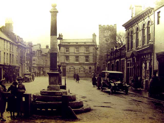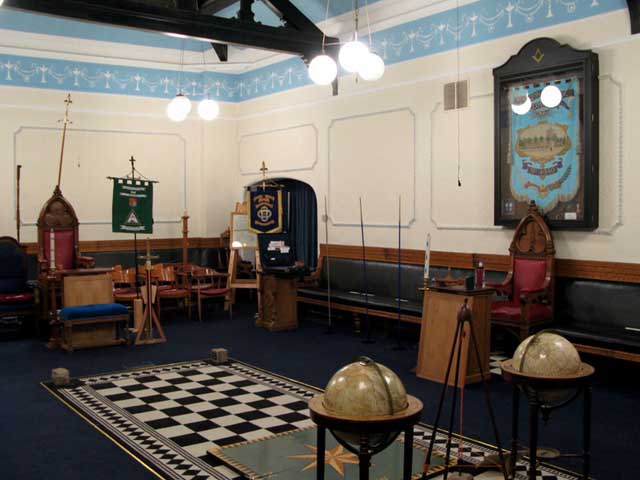 The hall entrance which is next to the old “Constabulary Station” has an excellent carved stone facade with a square and compass at its head, once inside there is a snug well appointed lounge area on the left with access to the bar, some fascinating large pictures adorn the walls showing the square and other local places of interest in times gone bye. | |