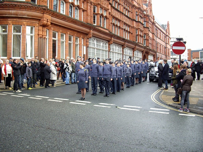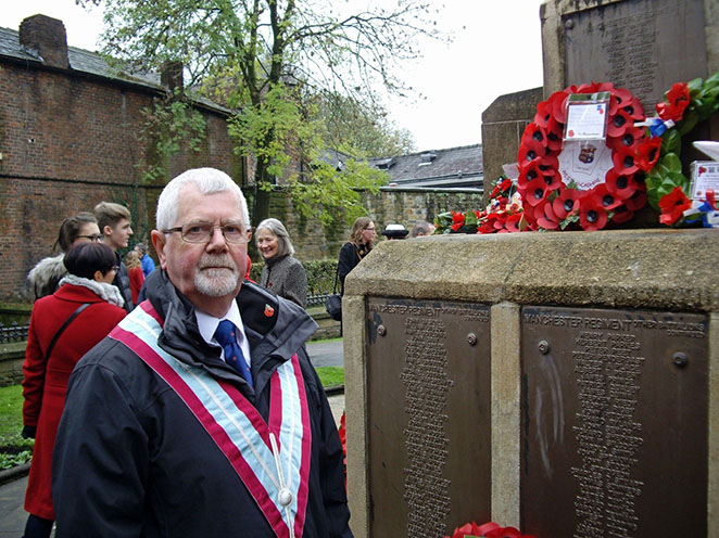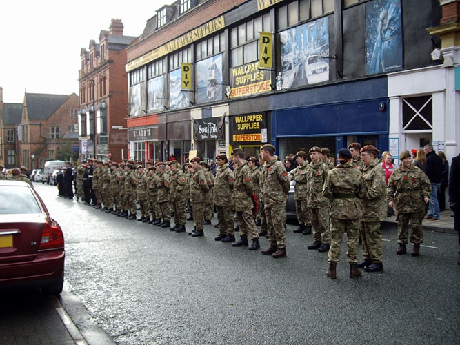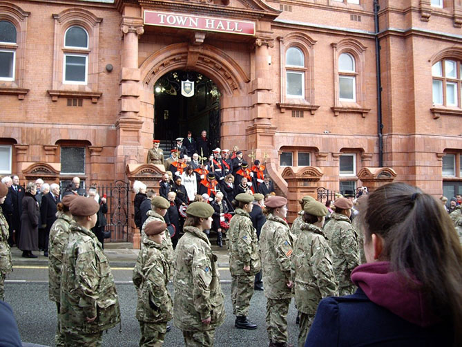 The annual Remembrance Parade assembled at Wigan Town Hall at 10.30 a.m. and processed along its usual route of Library Street, Rodney Street, King Street, Wallgate, King Street West and Crawford Street to the war memorial in All Saints' Gardens. |