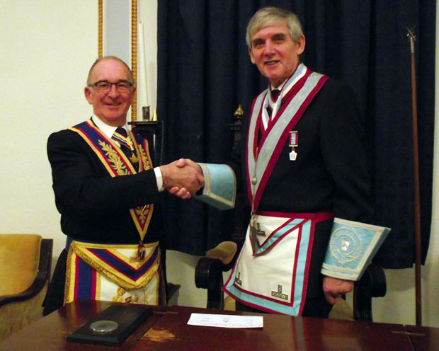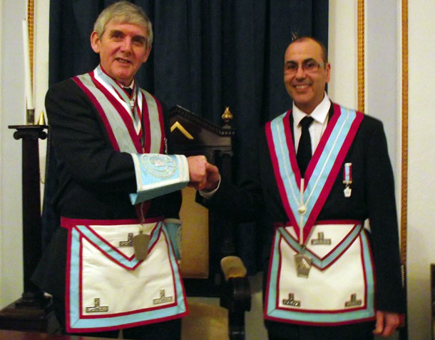 Graham Bailey congratulates Alan on becoming WM of Semper Fidelis. |
