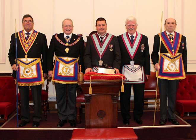 Following the opening of the lodge by W.M. Geoff Jackson and on completion of general business, the DC, Chris Hamilton, proclaimed the admission of Ian Nairn, P.G.J.O., A.Prov.G.M. to the lodge, who was received by the assembled Brethren with due deference accompanied by Brian Molyneux, Ken Boon, David Emmerson, John Ryan, Andrew Whittle and Tony Cross. |