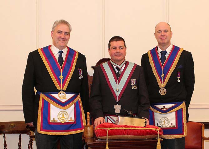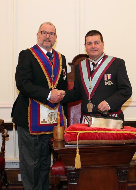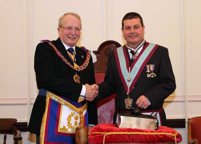 W.Bro. Andrew S. Whittle, Prov.G.S.W.Bro. Roy Hedges, newly Installed Worshipful Master |