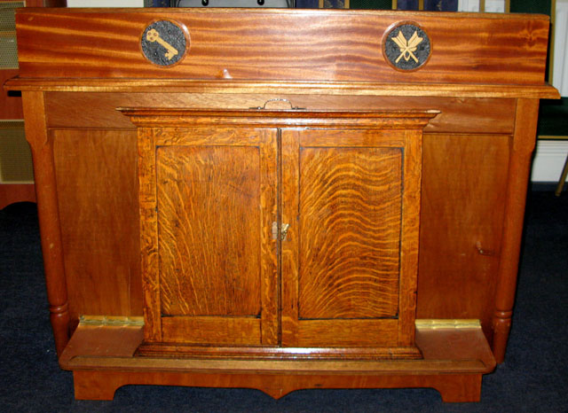Once inside I had a quick look round as you know is my nature, the dining room was all ready laid out for the Festive Board and again had a magnificent view of the Golf Course, back towards the entrance I climbed a spiral staircase which showed a sign for the different robing rooms, case deposited and it was off to the Lodge Room. As usual even though I was there 90 minutes early already in situe was the Provincial Director of Ceremonies W.Bro. Dave Emmerson, always early, always paying close attention to every detail for the evenings proceedings. I did take a few pictures around the Lodge room including a very interesting Secretary’s table which contained the Lodge Warrant, before too long it was practise time. The Prov DC ably assisted by the Deputy and Asst DC were soon putting all the Acting Provincial Officers through their paces and finished with Dave’s immortal words “Don’t leave your wands in the Lodge”  On making our way back to our allotted rooms to prepare for the meeting the RW Prov GM Bro. Keith Alan Beardmore could be seen greeting one and all, making everyone from the newest Brother to those of Highest Rank feel welcome and how pleased he was that they had attended.