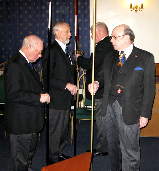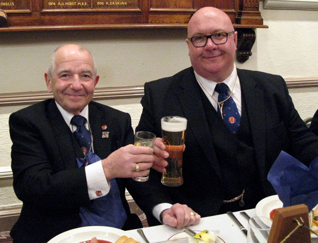 Well if you thought that was it wrong, the PGM took up the Gavel of the Lodge from the newly Installed Master and opened a Meeting of Provincial Grand Lodge, (not often witnessed in Private Lodges)  before calling for W.Bro. Leslie T. Moore PPrJGW (Lodge Treasurer) to be presented to him, he gave all present an insight to all the outstanding work Leslie had done for Temperance Lodge including its move from Hope Street to Woolton which did incur the loss of considerable members now thankfully after a lot of hard work the Lodge is growing strong again by new Joining members, to honour the man and the Lodge the RW,PGM promoted Leslie to PPrGSW. Following long well earned applause the RW.PGM closed Prov Grand Lodge and returned the Gavel to the WM.