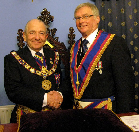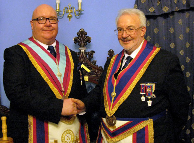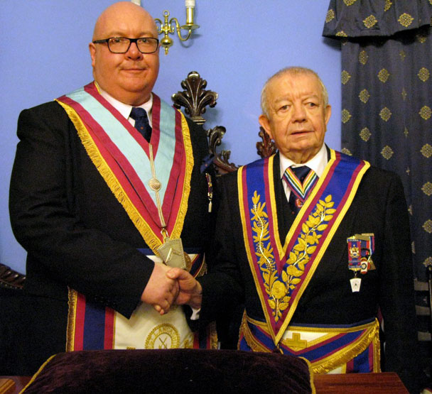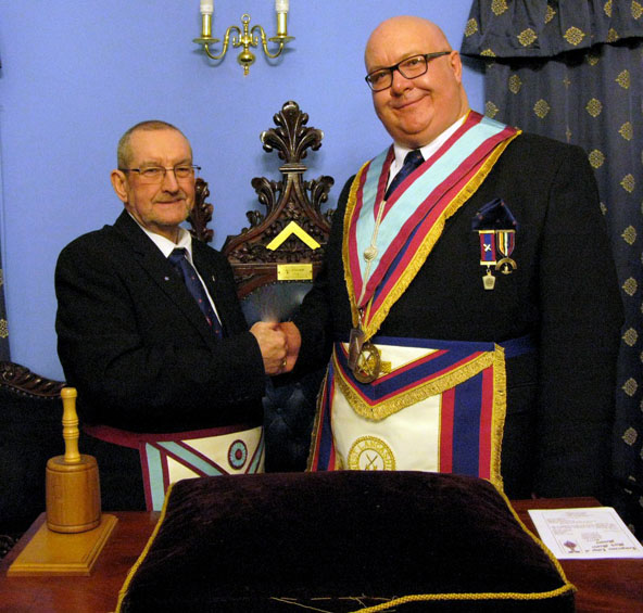 Once the Gavel had been returned business of the evening resumed and here as far as I’m aware was another First, well certainly something which I had never witnessed before, one of the Joining Members W.Bro. Stephen Lyon entered and in the blink of an eye became the Master Elect and was duly Installed in to the Chair of Adoniram, by W.Bro. Humphries, now as I think everyone would agree that must have taken some nerve and was handled superbly by the new Temperance W.M. Bro Lyon. All the new officers were appointed and invested and the usual Addresses followed which were all excellent but it has to said the star of the evening was the presentation of the Tools by Bro. Doug Holgate which was something special for a relatively new Mark Mason in front of such an august gathering, he did tell me later that he was soon going in to be Installed in to the Chair of his Craft Lodge as well the office of ”J” in his Chapter, now that’s I call a dedicated Mason.