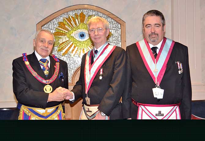APGM Michael Clarke congratulates John on his appointment with Installing Master Gareth. |