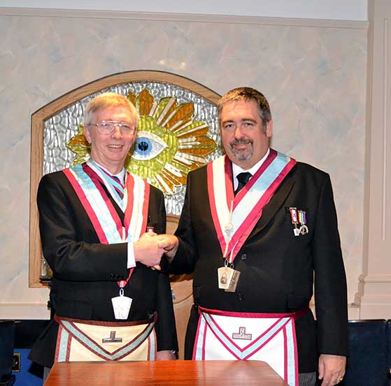 Gareth congratulates John on his Installation into Westhoughton Mark Lodge |