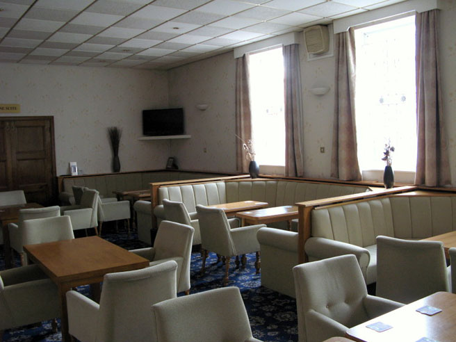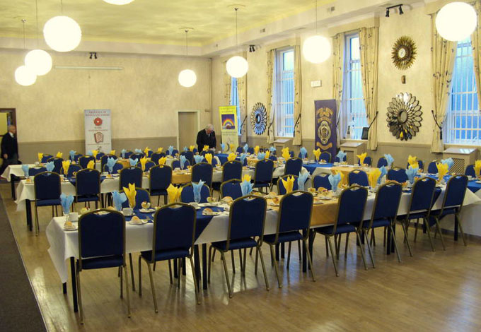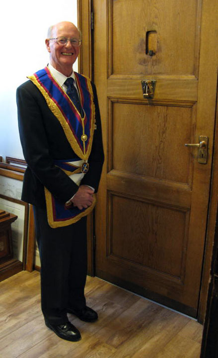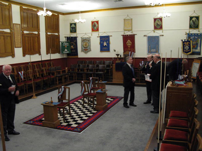 Another five minutes and I was turning into the large car park, from the outside the Hall is a nice tidy building and it was great to see the Union Jack flying proud above the Square and Compass, a nice touch. Once inside I started snooping around as usual, a well-appointed entrance area with a staircase off to the left complete with chair lift, off to the right was a very well furnished lounge complete with bar, straight ahead was a large dining/function room all set up for tonight’s Social Board. On climbing the stairs there are several rooms on the right for regalia storage, committee meetings and robbing areas, cross the floor and you pass through a door into a really smart Temple which seems to be very clean cut and modern yet retains really nice old panelled lower walls, Lodge Banners and Carved Lodge History Boards.