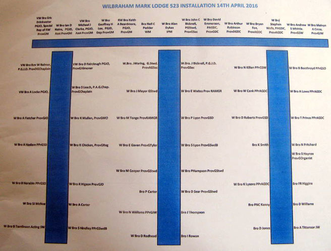 The Lodge meeting opened on time and after dealing with its general business items the RW Prov Grand Master Bro. Keith Alan Beardmore entered accompanied by Acting Grand and Provincial Grand Officers, he was offered the gavel as is his right by the WM Bro. Alan Dykes and on this special occasion he said he would accept it for a short time.  The PGM now introduced all the Acting Grand and Provincial Grand Officers to members of the Lodge, which I can tell you makes them feel like they are part something special which of course they are after all this is the Mark Degree.