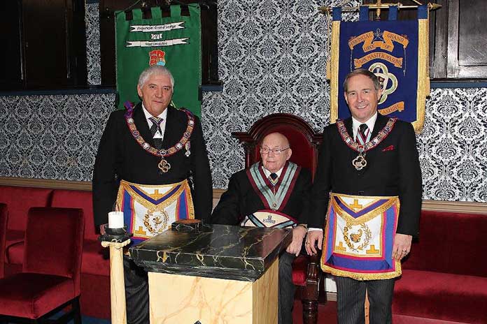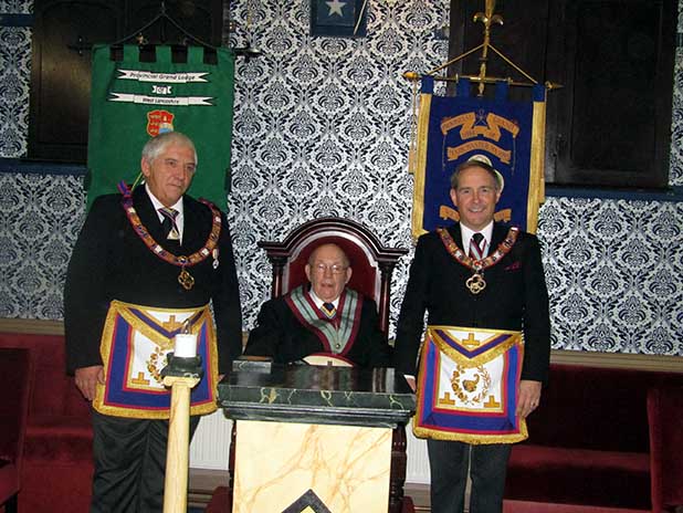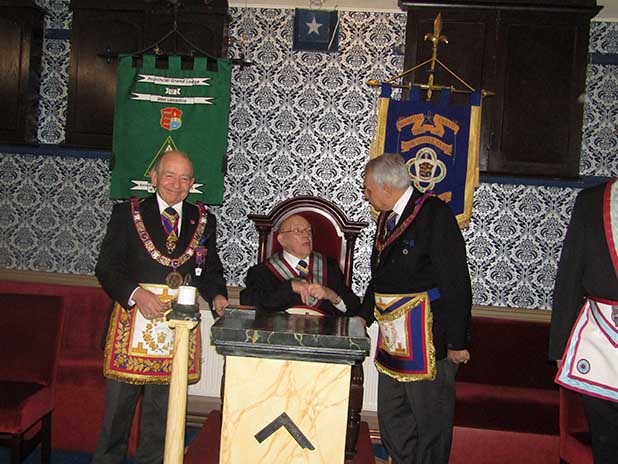 Our RW Provincial Grand Master Keith Beardmore broke with tradition, and proceeded to the North-West side of the Lodge room in Garston Masonic Hall. The reason for the change, was to enable the Brethren to focus on the Celebrant W Bro Jim, much to the delight of all present. |
