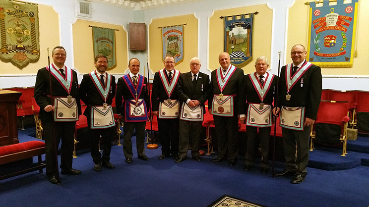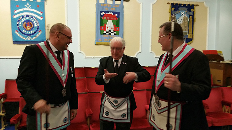 Jeff’s long standing friends and co-members of Leyland St Andrews, Craft Lodge, Stewart Seddon and Chris Wild, ADC and Secretary respectively, had managed to pin him down just long enough for the paperwork to be completed and the scene was set. |