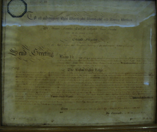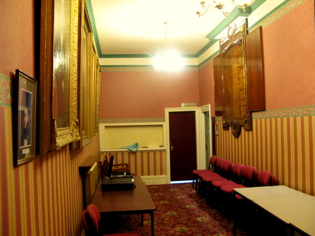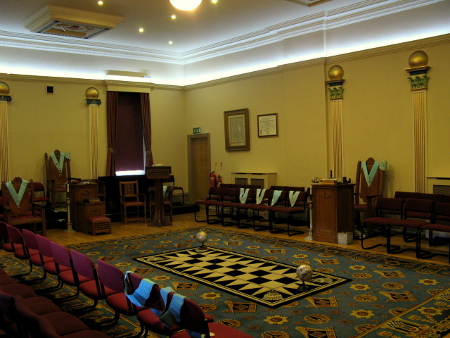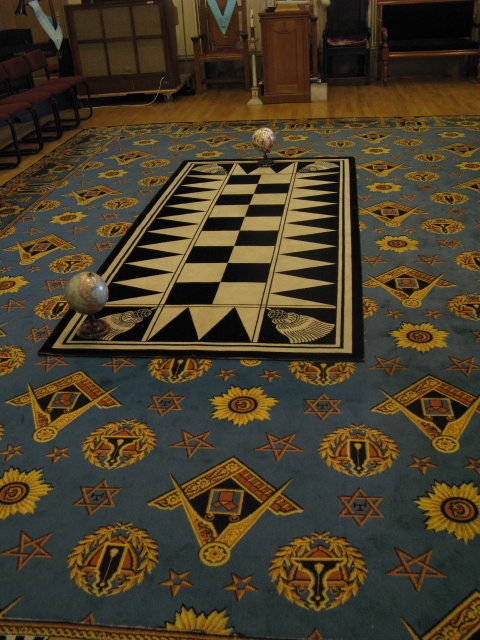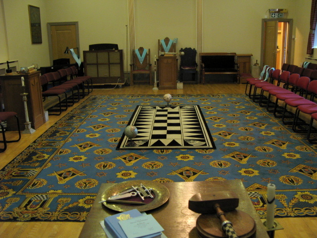 It is a Lodge of great tradition and sometimes have been known to perhaps follow some of their own rules (traditions)  as a private lodge which the Province don’t seem to take too kindly and have even been known to send a minder down (undercover Mason 008) there to see just what’s going on.!! Of interest to note is the fact that they have a picture of every WM since the Lodge was Consecrated 150 years ago, now that’s something I have never seen in any other Lodge, amongst the pictures I have taken you will see a block of stone complete with a chisel and maul, what’s it doing there you may ask !, well the newest member in each degree has the pleasure of being seated next to it and during any breaks in the ritual for whichever degree it may be in he has to tap out the knocks of that degree on the stone which means there are usually lots of chips all over the floor at the end of every meeting. You will also notice a picture of the square carpet with a globe at each end one of which usually finishes up rolling around the floor like a football especially in the third degree! The beautiful ornate carpet does contain symbols of all the degrees including the Mark Degree and I only wish they had one there because I would join it.