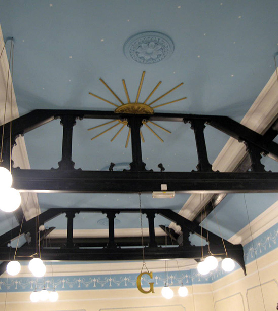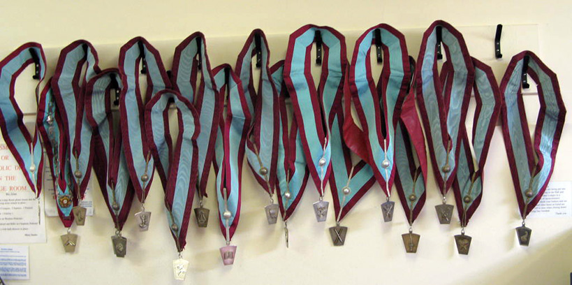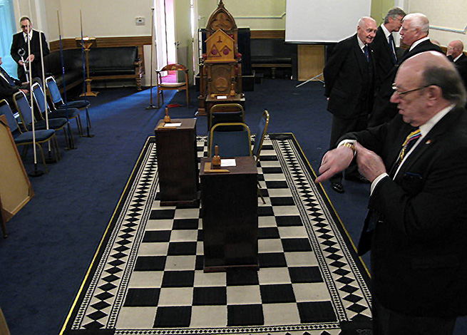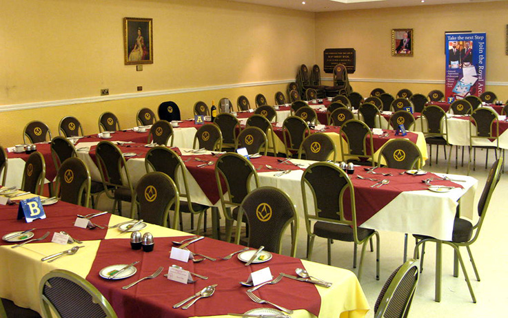 For anyone who hasn’t been to this hall it is like a Tardis, situated in a lovely old town square complete with stocks an old Constabulary Police Station and a picture post card church at the far end. Once inside the building the good sized dining room complete with bar is found on the ground floor, a set of stairs takes you up to several robbing rooms and the well appointed Temple complete with unique ceiling rafters, a Wedgewood blue style wall freeze and plenty of Lodge banners, in other words lots of character. |