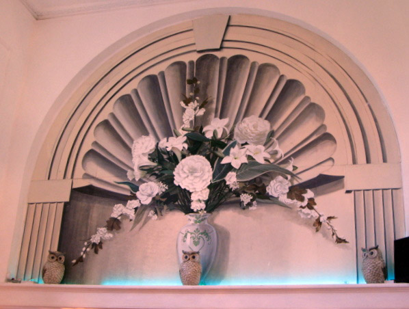 Up a Hollywood style sweeping red carpeted staircase go straight ahead into a small passageway and on your right is the Lodge room, light blue carpet, deep blue seats , eggshell blue walls with red inset panels, several lodge banners and three carved principal officers chairs complete what is a really nice pleasant Temple. | |||