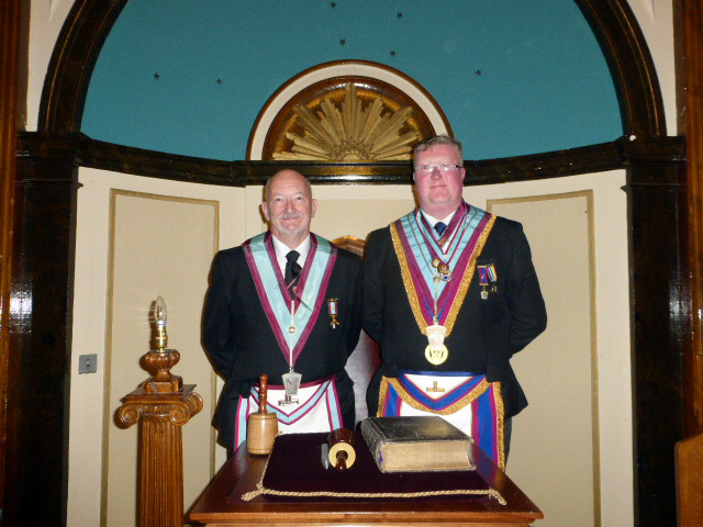 With WBro Hyde acting as Worshipful Master the Lodge was opened and the acting WM welcomed VWBro Eric Drinkwater. The acting DC WBro Steve Walls PAGDC Prov AGDC carried out the Salutations. Once these were complete the installation ceremony began. The DC WBro Steve Walls, (Dad) presented WBro Chris Walls, (Son) to the WM for the ceremony of installation. WBro Hyde then performed a very fine installation ceremony. He also presented the working tools and delivered the address to the New Master, at same high level. The Keystone address was given by WBro Jimmy Kontzle PProvGSW. With the address to the two new wardens delivered by WBro Bob Baird. It was down to WBro Steve Walls for the address to the Overseers. VWBro Eric Drinkwater did the Brethren’s address. At the end of the ceremony the WM presented a cheque for the Charities to the VWBro Eric Drinkwater. In the risings there were two Grand Lodge Certificates to present to another father and son pair Christopher Brufell, (Son) and John Brufell, (Dad) this was carried out by VWBro Eric Drinkwater. | |
