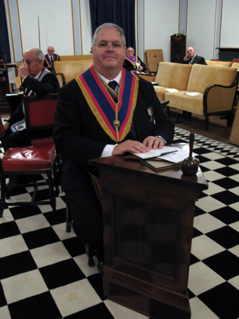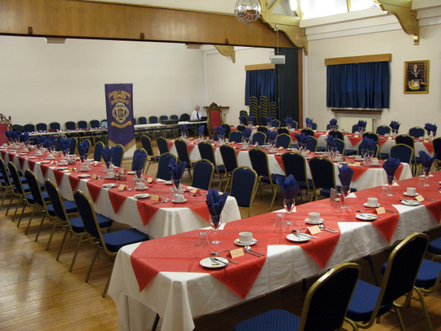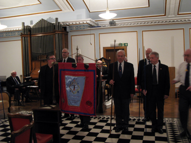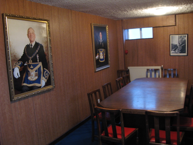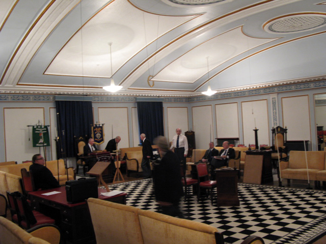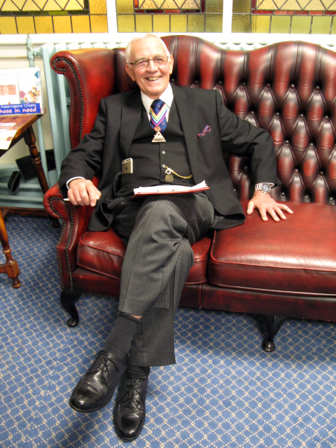 What a relief walked back towards the Hall, round the corner of the Police Station, next left and I had arrived, a Door amongst the shop fronts with small Square and Compass, I thought is this it ??  Well what a surprise I had in store “Aladdin’s Cave” comes to mind, through the door up the stairs and into one of the nicest Lodge and Dining rooms I have ever seen.  Went and had a chat with a very pleasant guy who was in fact the Lodge secretary Geoffrey Crosland PGStdB, as it turned out he was in fact going to be carrying the new Banner for Dedication later on in the evening. I re-located a summons and some other interesting material which I found kind of lying about, found myself a very comfy seat on a small settee near to the Lodge entrance and thought how nice is this.