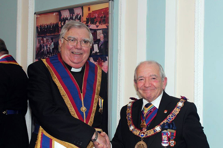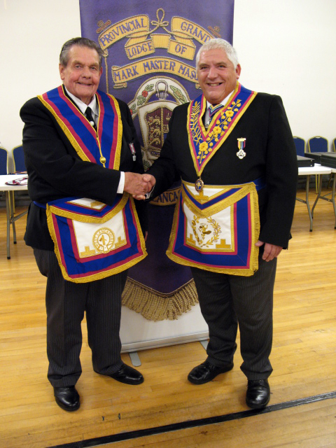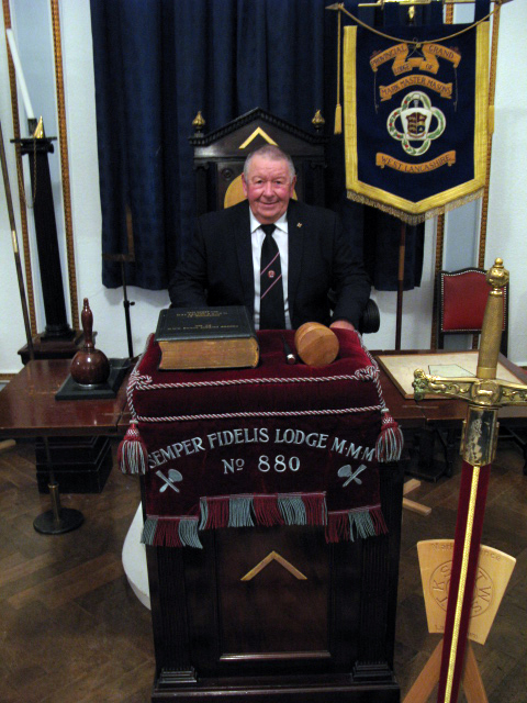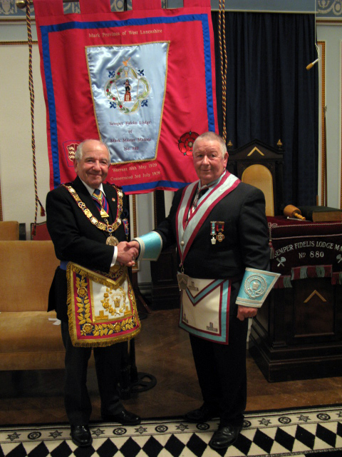 Once it was placed in a prominent position at the right of the WM, W. Bro. S.W.Leach the Prov Chaplain gave a wonderful oration regarding the detail work on the banner and their meanings, it was very, very interesting and received loud acclaim from all present. Now usually this is where the PGM would hand back the gavel to the WM for the normal Lodge proceedings to continue but not tonight, Keith had a surprise for one of the Lodge members, he asked for W.Bro.Roger Buckley PPrGJW to be presented to him at the pedestal, he was delighted on this special occasion to promote Bro.Buckley to PPrGSW for the many years of dedicated service he has given to Mark Masonry in general and Semper Fidelis Lodge in particular, there followed long and loud acclaim by all.