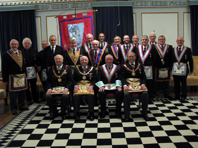 Now to the main event, the Lodge opened at 6 pm, usual housekeeping was dealt with and before too long it was time for the PGM RW Bro. Keith Alan Beardmore PGJO to enter accompanied by members of the Prov Team, Prov Executive and distinguished Grand officers.  The WM Bro. Kenneth W Turner gave greetings to Keith and offered him the gavel which he was on this occasion happy to accept. The PGM then proceeded to open Provincial Grand Lodge which is required for the Banner Dedication Ceremony to take place, the Team assembled in due form and made presentation to the PGM, the WM holding one corner of the banner presented it and asked for it to be accepted on behalf of Semper Fidelis Lodge, which the PGM was delighted to confirm.