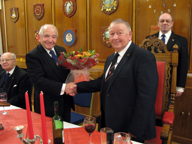 A quick photo shoot followed the closure of the meeting then it was off for some liquid refreshment and a chat before taking up the allotted seats at the social board in the wonderfully laid out dining room, I would say again what a wonderful Masonic Hall they have here in Lytham. An excellent meal was served up at a very reasonable price by very efficient and friendly staff then it was time for the usual Toasts and responses which at Mark meetings are not the type which send you to sleep and of course we all wait with baited breath for the PGM’s joke to be delivered never the same one twice, although some say (not me of course) they are likened to Les Dawson’s piano playing. At its conclusion the WM had much pleasure in presenting the PGM with a lovely bouquet of flowers for his very understanding wife June and that was it all over too soon, why is this degree so different to all the others, why are we happy to make long journeys, drive round and round trying to locate the halls, meet people we have never seen before,  we shall probably never know but personally I always think great tonight it’s a Mark meeting which is not the case with some of the other degrees I belong to.
