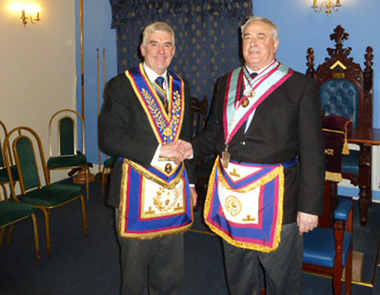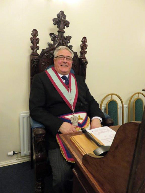 WBro Steve Lyon then installed WBro Derek Gaskell Prov GJD into the chair.  WBro Fred Hulse PProvGSD presented the working tools to the Worshipful Master, with WBro Bryan Humphries PAGStBr giving the Keystone Jewel address and the address to the Worshipful Master.