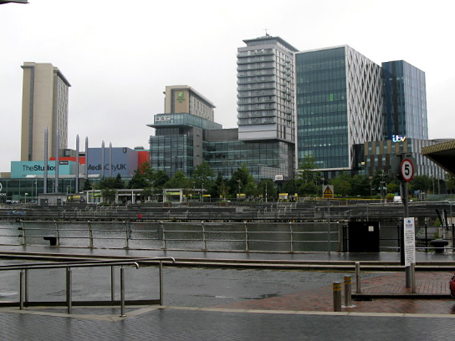 Looking across a dock at the BBC & ITV |
