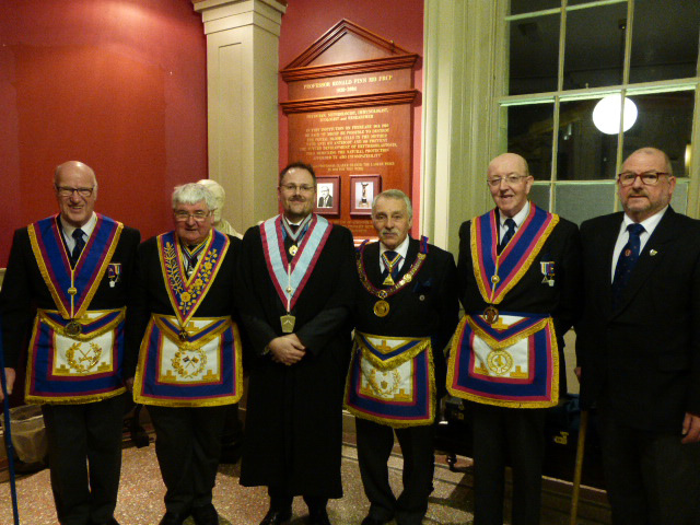 For the installation ceremony the Worshipful Master handed over the chair to WBro Chris Walls Prov GIG. WBro Walls asked WBro Dr. David Karsa PGJD to occupy the chair of Senior Warden and WBro Alan Fairhurst Prov GJW to occupy the Junior Wardens Chair. WBro Tom Marlow PProvGJW occupied the chair of Inner Guard. When everyone was in their respective places WBro Walls installed Bro Adam Kennaugh into the Master’s Chair. |