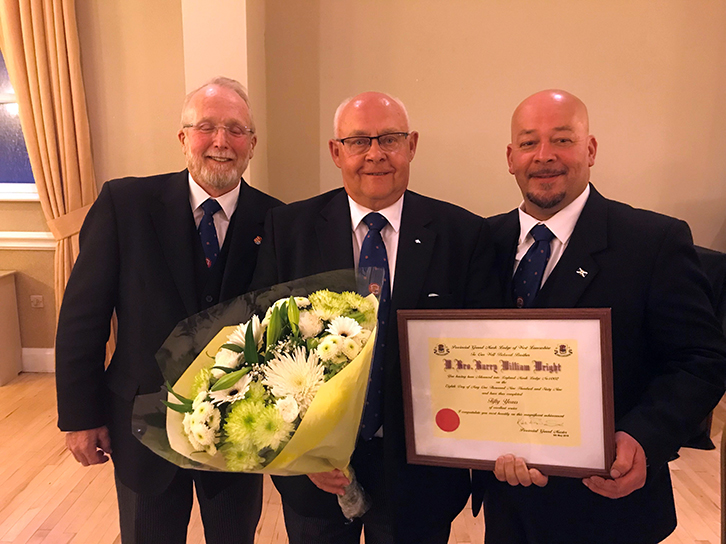 On Thursday the 9th May, 2019 Leyland Mark, No. 1002 gathered together at Chorley Masonic Hall for a Special Event. One of their stalwart members, Barry Wright, P.G.St.B. was celebrating 50 years as Mark Man.