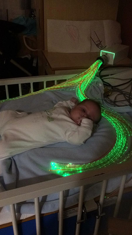 Daniel spent five days in the children’s ward with four of those being in the high dependency unit. It was suggested that optical light strands may help settle and comfort Daniel but initially there was some difficulty as the ward had only one set of the lights. When the lights were placed around Daniel’s cot they did indeed help him settle down. |