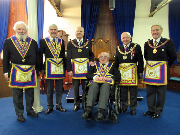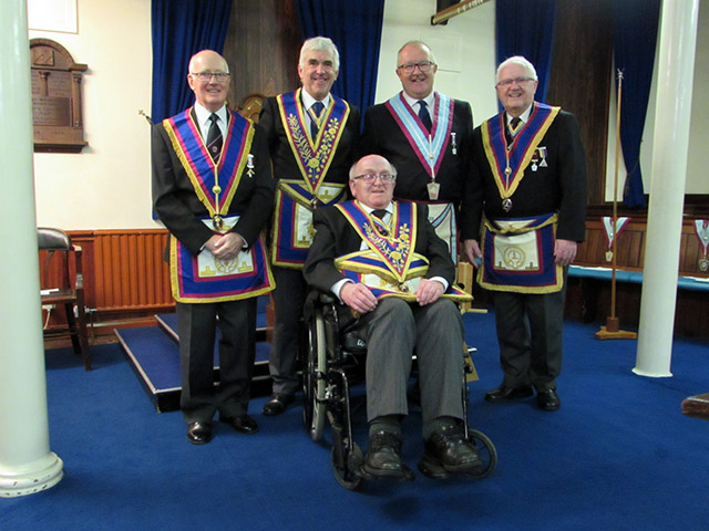 The Lawrence Lodge of Mark Master Masons hold their meetings at the Masonic Hall Chorley and on 21st. March some seventy Mark Masons attended Lawrence Lodge to join Worshipful Brother Denis Onslow P.G.J.D. in celebrating 50 years in Mark Masonry. The Lodge was honoured by the attendance of Right Worshipful Brother Keith Alan Beardmore and his Provincial Team, amongst the other distinguished guests were Right Worshipful Brother Thomas Firth Jackson Past Grand Junior Warden of The Grand Lodge of Mark Master Masons (Grand Master of the Allied Masonic Degrees), Worshipful Brother John Stewart Seddon Past Provincial Grand Registrar (Past Grand Senior Deacon of United Grand Lodge,  Assistant Provincial Grand Master for the Leyland and Chorley Group of Lodges and Chapters), Very Worshipful Brother Graham Paul Snape Past Grand Junior Overseer of The Grand Lodge of Mark Master Masons (District Grand Prefect for West Lancashire Allied Mason Degrees) and Worshipful Brother John Charles Bicknell Past Grand Junior Deacon of The Grand Lodge Of Mark Master Masons, Provincial Secretary (Deputy Provincial Grand Supreme Ruler in the Order of Secret Monitor).