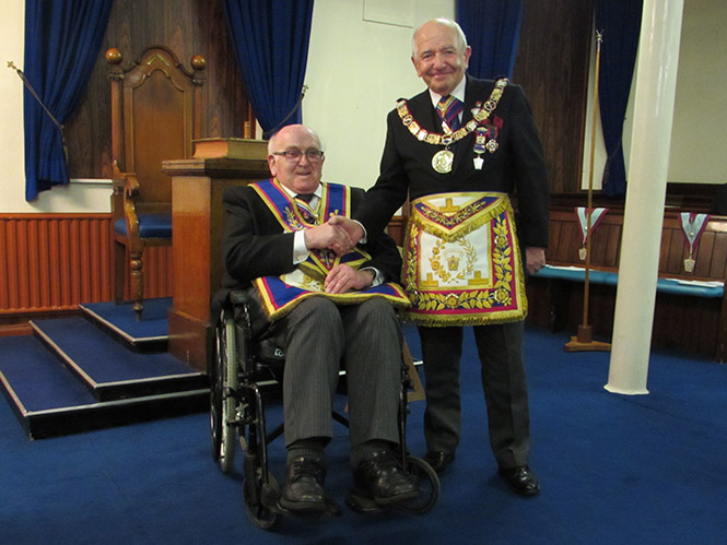 After the usual salutations the Provincial Grand Master directed the Provincial Grand Director of Ceremony to present Worshipful Brother Onslow to him. The Provincial Grand Master vacated the Master Chair and was escorted to the West where he delivered a very Interesting and informative history of the life and times of the Celebrant over the last 50 years Two congratulatory certificates one from The Grand Lodge of Mark Master Masons and one from the Province of West Lancashire were read by the Provincial Grand Secretary and presented to Worshipful Brother Onslow which he received to acclimation. The Right Worshipful Provincial Grand Master returned to the master’s Chair and invited the acting Worshipful Master to re-occupy the chair to complete the remainder of the business.