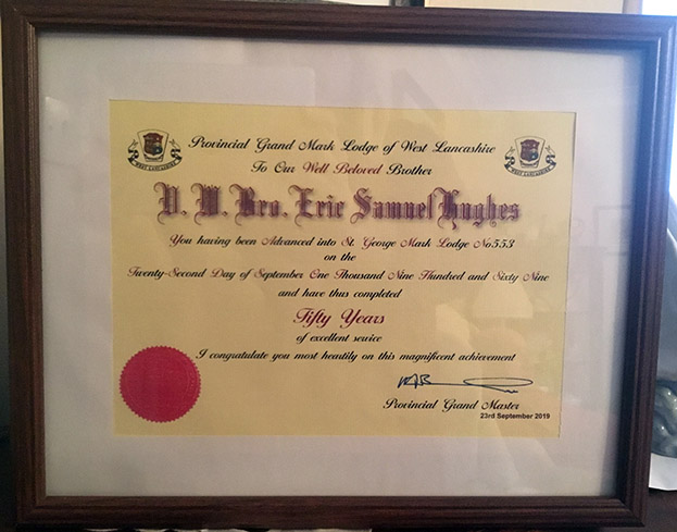 I would l also like to pass on my gratitude to the Brethren who travelled the length and breadth of the Province, and from North Wales and Cheshire, to mark my 50th year in Mark Masonry. | |