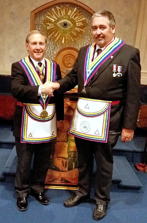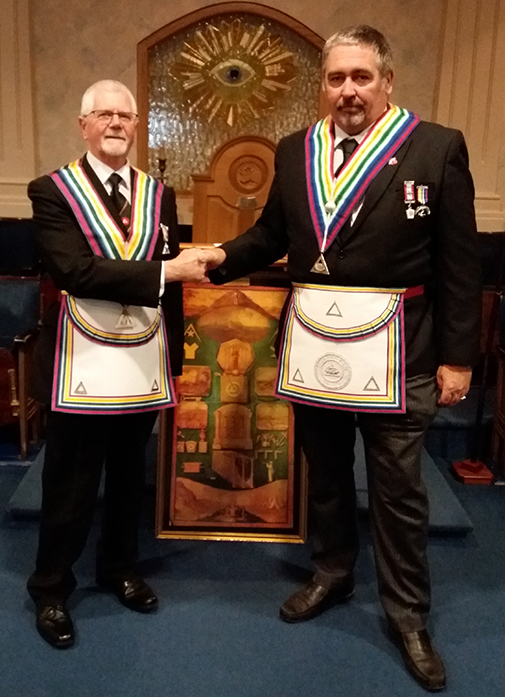 Terry congratulates the newly Installed Worshipful Commander Gary |