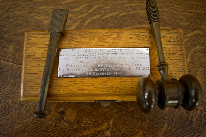 Taken out of a cupboard where it has been hidden from view and now placed on the table of the secretary during meetings is a small wooden box. This box was crafted to hold the small mallet and chisel which sit in front of the WM. A hall-marked silver plate on the box bears the legend:- “Furness Mark Lodge No 36. Mallet and Chisel made from genuine Furness Abbey Oak in 1937 from the foundations of the Abbey and dating back to A.D. 1127. Presented by Mr Archibald Linn, Past Master of Hartington Lodge No 1021 2nd December 1937.” |