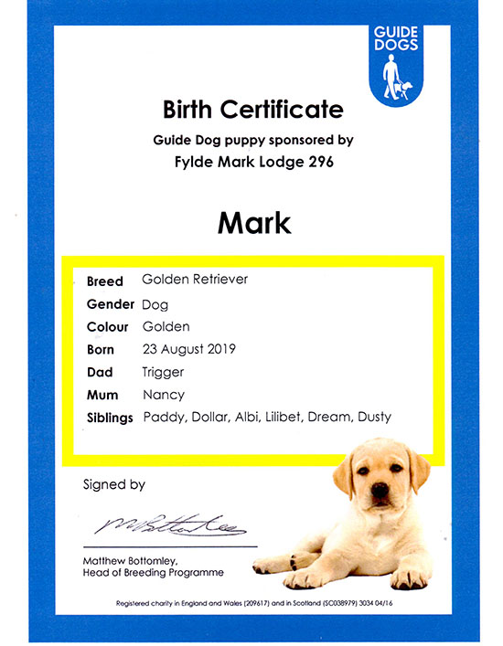 Before any of that can happen, I have to be trained to very high standards, this has become possible by the members of Fylde Mark Lodge of Mark Master Masons No 296. The Charity Steward Worshipful Brother Peter Green Past Provincial Grand Senior Deacon, came up with the idea of the Lodge sponsoring a puppy to be trained as a guide Dog, he then asked if the Mark Province would support this very commendable venture. When they answered “Yes” it was time to start the ball rolling and Peter made many phone calls and visits to the Blind Society, all before I’d even been born. I have heard that my training will take two years and the Mark Degree have promised £5,000-00 towards my feeding and preparation for my new life. Now being a very small dog at the moment (as you can see from my picture), that sounds like a lot of bones to me! There will be photo opportunity’s during the next two years to show my progress, so that the members of Fylde Mark Lodge and the Mark Province of West Lancashire will be kept informed of my “Advancement”. |