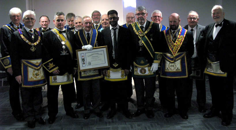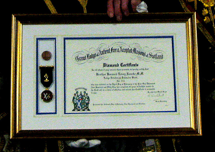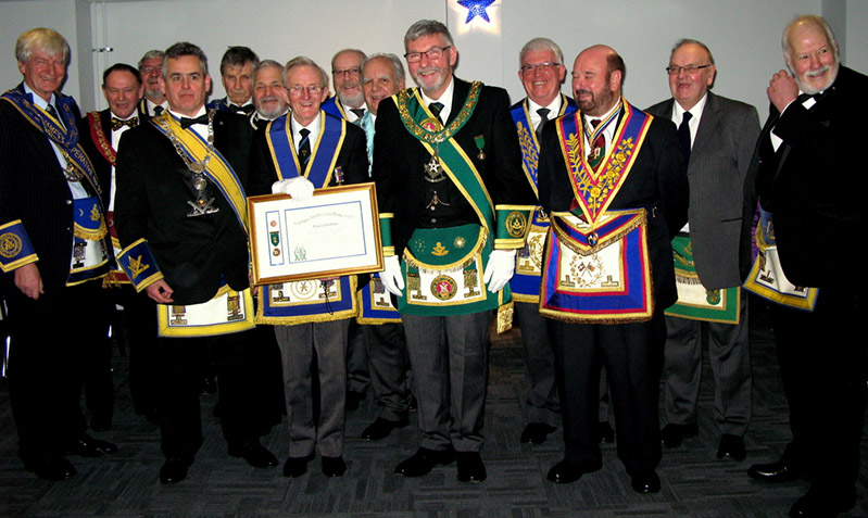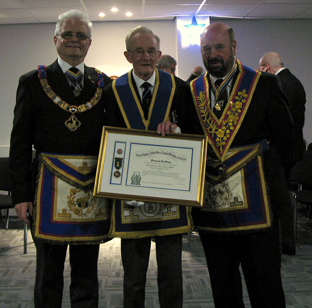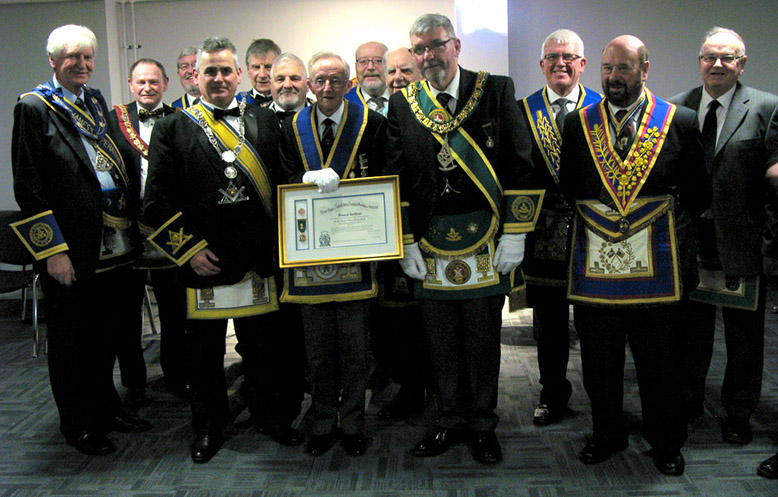 I had the honour of being presented to the WM as a chain bearing Grand Mark Officer, now that was special. Proceedings went along at a pace then it was time for W. Bro. Bernard Rourke to be escorted in to the Lodge and receive due acclaim for his 60 years as a Mason, a resumé of his private and Masonic life was given, he was then presented with an illuminated framed Certificate and a very special Jewel to commemorate his fine achievement. | |