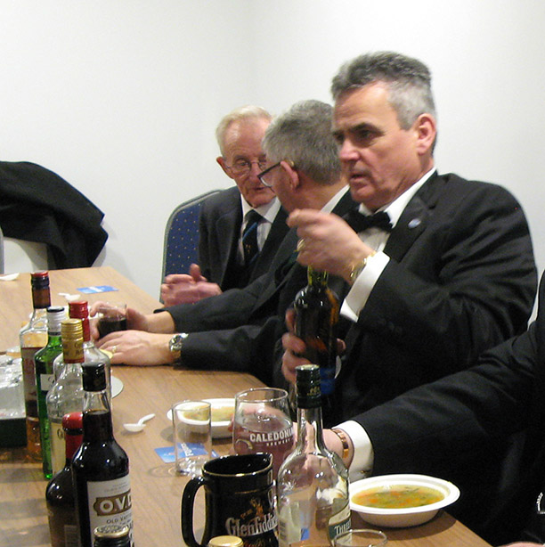Basically that was it, time to say our goodbyes and thanks to members of the Edinburgh Defensive Band Lodge, we made our way to the end of street in the hope of waving down some taxis, now would you stop on seeing about 25 slightly sossled men waving at you, not to worry Bernard with the help of his wife Jesse had already organised our recovery, we got back to the hotel where we sat around for a while with another couple of whisky’s discussing what a great pleasure and success the evening had been and all the highlights we had shared together. | |