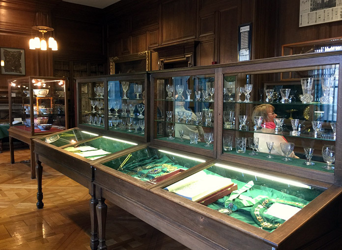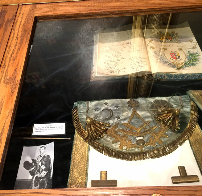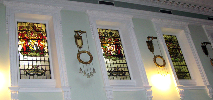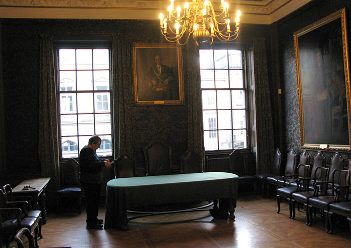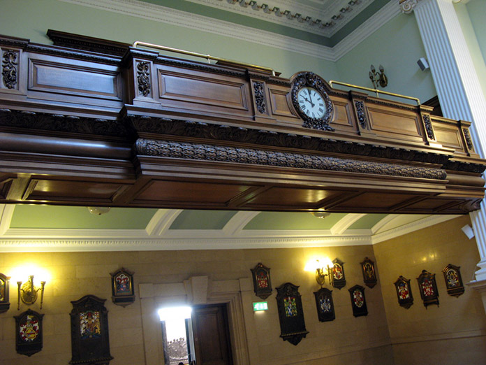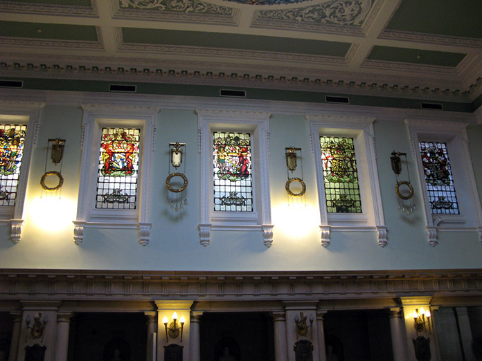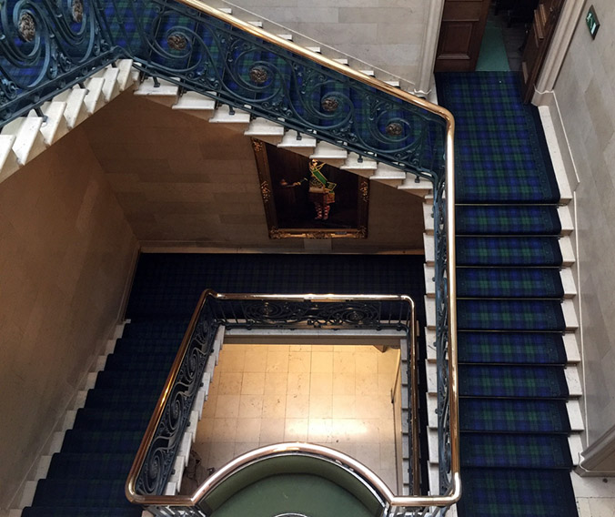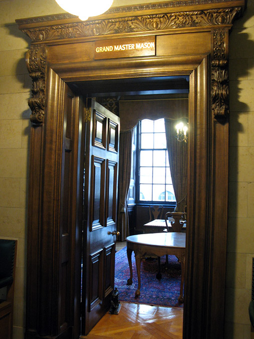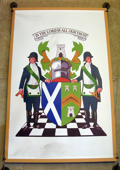 All of us who were going for the visit climbed aboard the coach but not until we had packed up our belongings ready for the trip home when we got back to the hotel. A short journey across all the road works known as Edinburgh, (it’s not quite that bad) and we arrived at 96, George Street. the home of Scotland’s Grand Lodge. My first impressions were a little disappointing as it is situated in amongst a row of other buildings and doesn’t shout out like I thought it would, the entrance is up a flight of six steps with two pillars either side, next are three very nice arched double doors, pass through those and you are inside a splendid reception area where we were welcomed by a fellow Mark Mason who had made a special visit to guide us around. | |