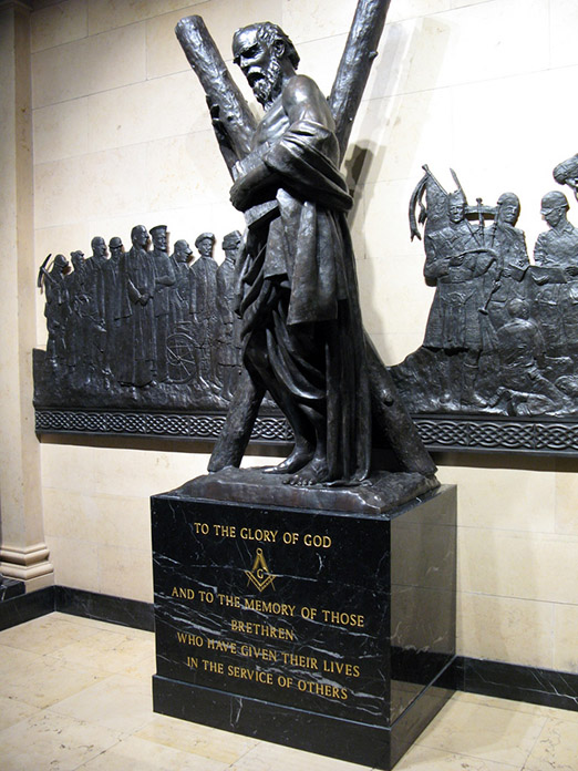 It was agreed that a Memorial Stone would be laid by the Grand Master, the Marquis of Tullirbardine on the 28th April 1911, his Grandfather the Duke of Atholl had performed the ceremony back in 1858 in the old building on the same site, on that occasion the The Scotsman reported the Ceremony in the following manner, “The spectacle was one which for grandeur has never been surpassed by any celebration in Scotland, the moment the level and square were adjusted one loud “Hurrah” broke out from the assembled Masons, a flag was immediately hoisted on the roof of the hall and in answer to this symbol the cannon in the Castle thundered forth their respect by several salvos, announcing the completion of the laying of the foundation stone of the new Freemasons Hall of Scotland” A temporary home at Charlotte Square was used during the new building work at a cost of £250 per annum, a further £16,000 was expended on pictures and furnishings and in May 1912 the Grand Secretary and his staff moved into the new building where business has been conducted for over 100 years. | |