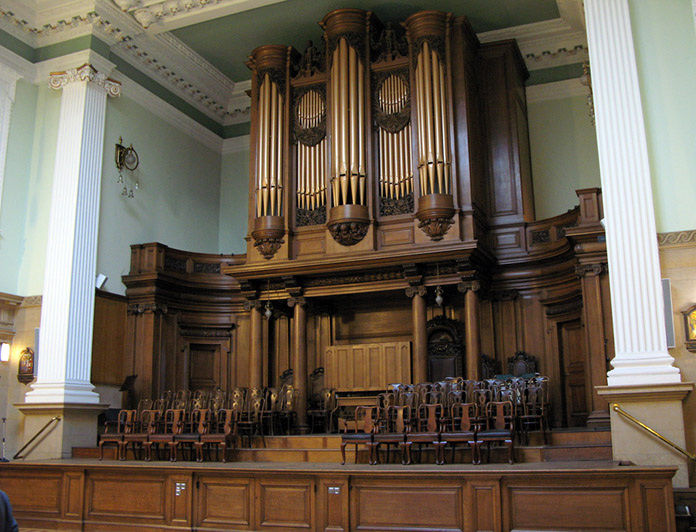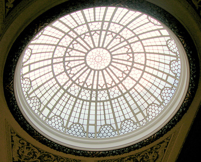 The main Lodge room is well appointed with a stunning organ at the back of a staged area, several wonderful stained glass windows run along the upper left hand side and an impressive domed circular window is central to the room, on looking to the opposite end from the stage there is a fair sized balcony which I was determined to get to just to see what the view was like. (you know me and my camera). | |