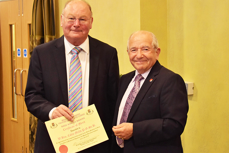 At the last Provincial meeting Colin Mills stood down after nine years of sterling service as Deputy Provincial Grand Secretary. Keith chose the occasion to present Colin with a Certificate of Merit to acknowledge his efforts on behalf of the Province. The fact that it was the only “business” conducted on the day and that his wife Sheila, along with so many of his friends were in close attendance, made the presentation more personal. |