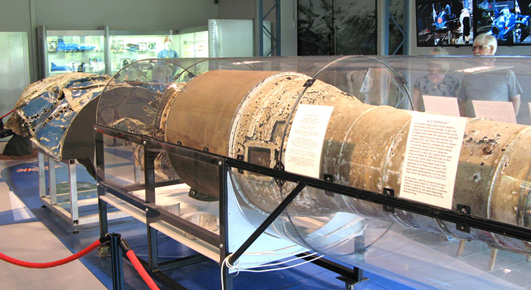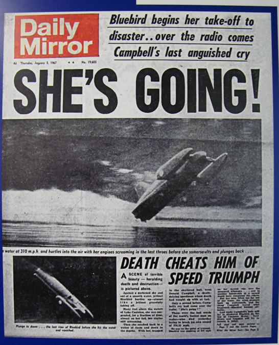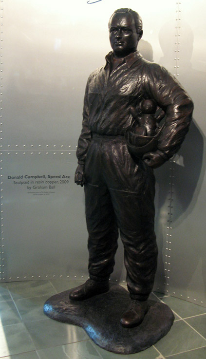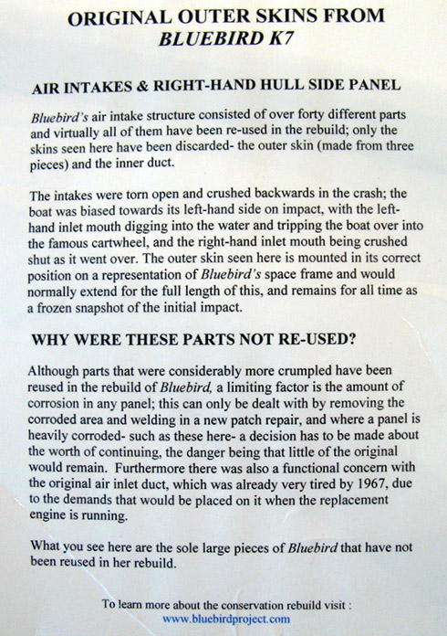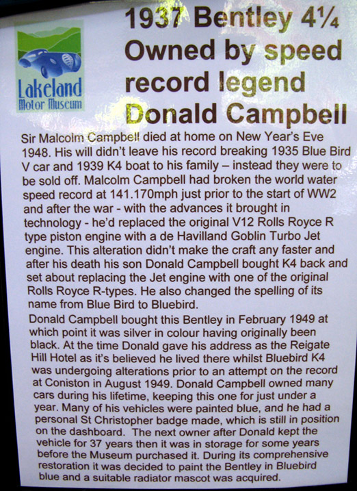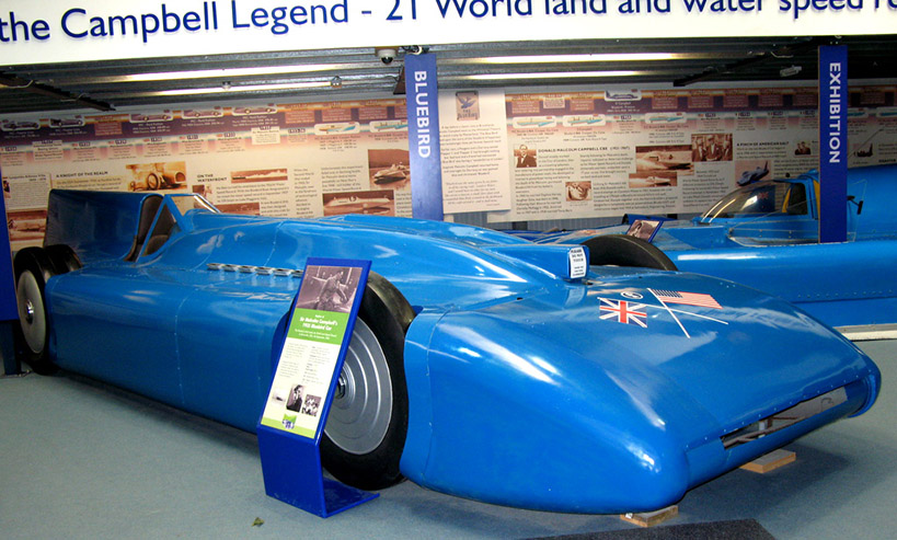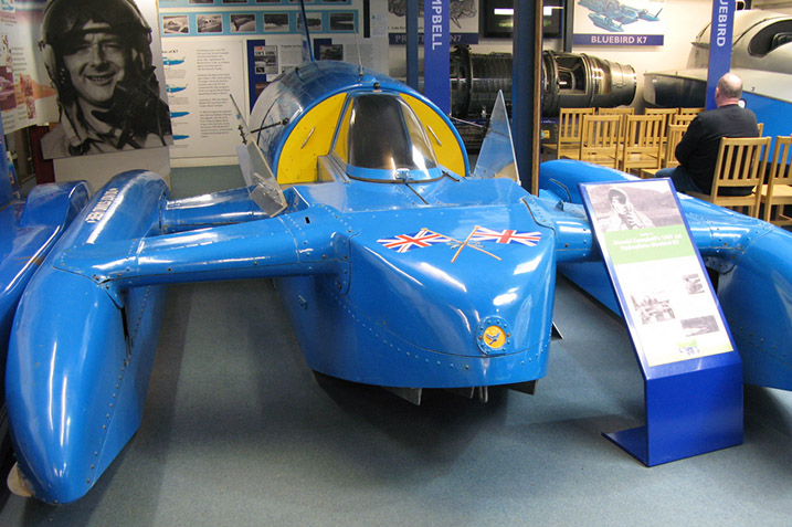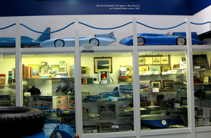 Before we moved on to the Bluebird display which is in another building we sat at the side of a picturesque fast flowing river having afternoon tea and scones from the first class Museum Café, you got that feeling that all was well with the world. Just a short walk and you arrive at the door of the building dedicated to the Campbells both Donald and his record breaking father Malcolm, here can be seen life size recreations of the vehicles used for both land and water speed record attempts along with again many interesting artefacts and a film showing the last moments of Bluebird K7. |